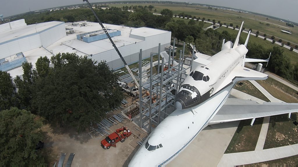 Driving up to Space Center Houston, guests immediately see the 240-ton complex standing beside the center. This foundation supports the 159-ton shuttle carrier aircraft NASA 905, the 80-ton shuttle replica Independence and a six-story tower that are used to enter both vehicles, as well as the exhibits inside NASA 905.