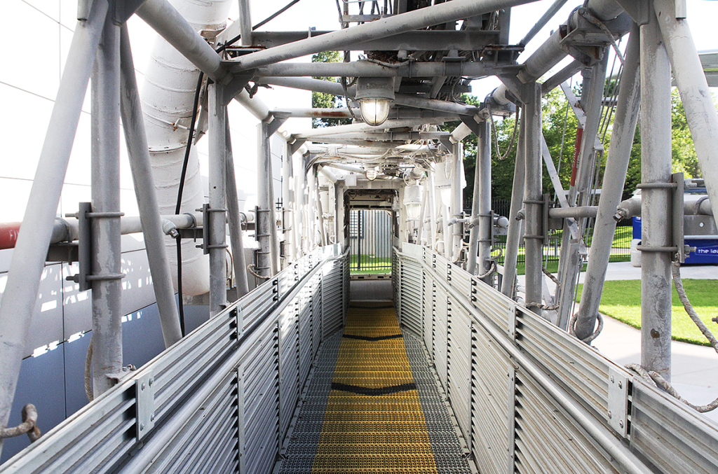 The end of the access arm features an environmentally clean room (“white room”) that mated with the shuttle orbiter and holds six people. The arm remained in the extended position until seven minutes, 24 seconds before launch to serve as an emergency escape route for the flight crew—that’s why the arrows point away from the direction of the orbiter.