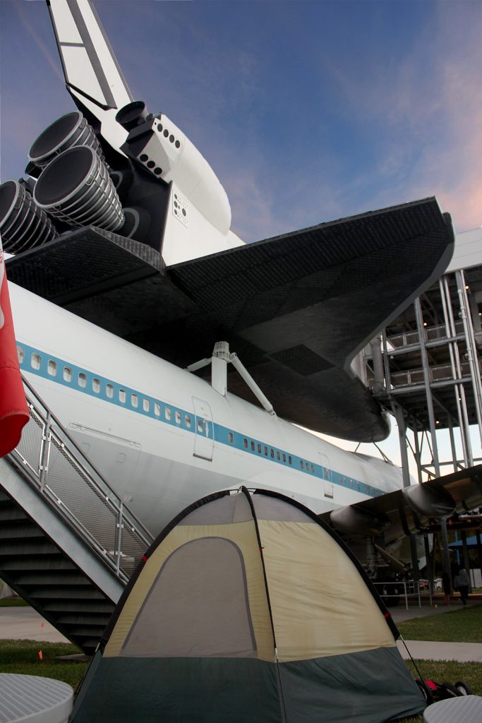 Pack your tent and set up camp under a twice-flown Falcon 9 rocket or in Independence Plaza, right underneath a Boeing 747, the shuttle carrier aircraft NASA 905, and our high-fidelity shuttle replica Independence. Prefer to cozy up indoors? All you need is a sleeping bag and a pillow to complete your campsite, surrounded by some of the rarest spaceflight artifacts on Earth.
